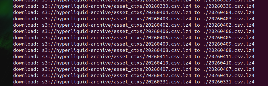 24 3 * * * USERNAME aws s3 sync s3://hyperliquid-archive/asset_ctxs/ FOLDERPATH --request-payer requester >> FOLDERPATH/sync.log 2>&1