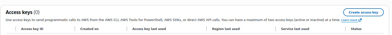 2. Scroll to Access Keys and Click on the Create access key button on top right of screen