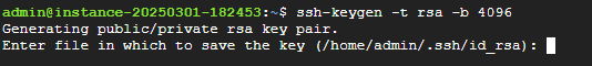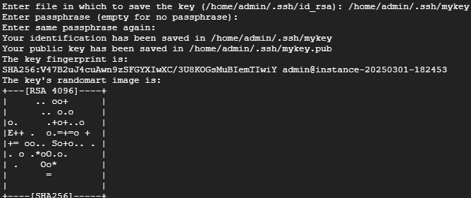 Below is an example of saving the key with a custom name instead of the default. This is especially important if you're creating a second SSH key or plan to manage multiple SSH public/private key pairs on your machine. In this case, I use the path /home/admin/.ssh/mykey — where /home/admin/.ssh/ is the .ssh directory (note that admin is my sudo username), and mykey is the custom name I've chosen for the key."