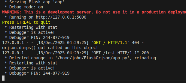 Then when we run the app and visit the /test url we will see that the orjson method is getting called on the route. Whilst this is only a small response, for larger ones there will be a significant performance increase as we showed at the beginning of this post.